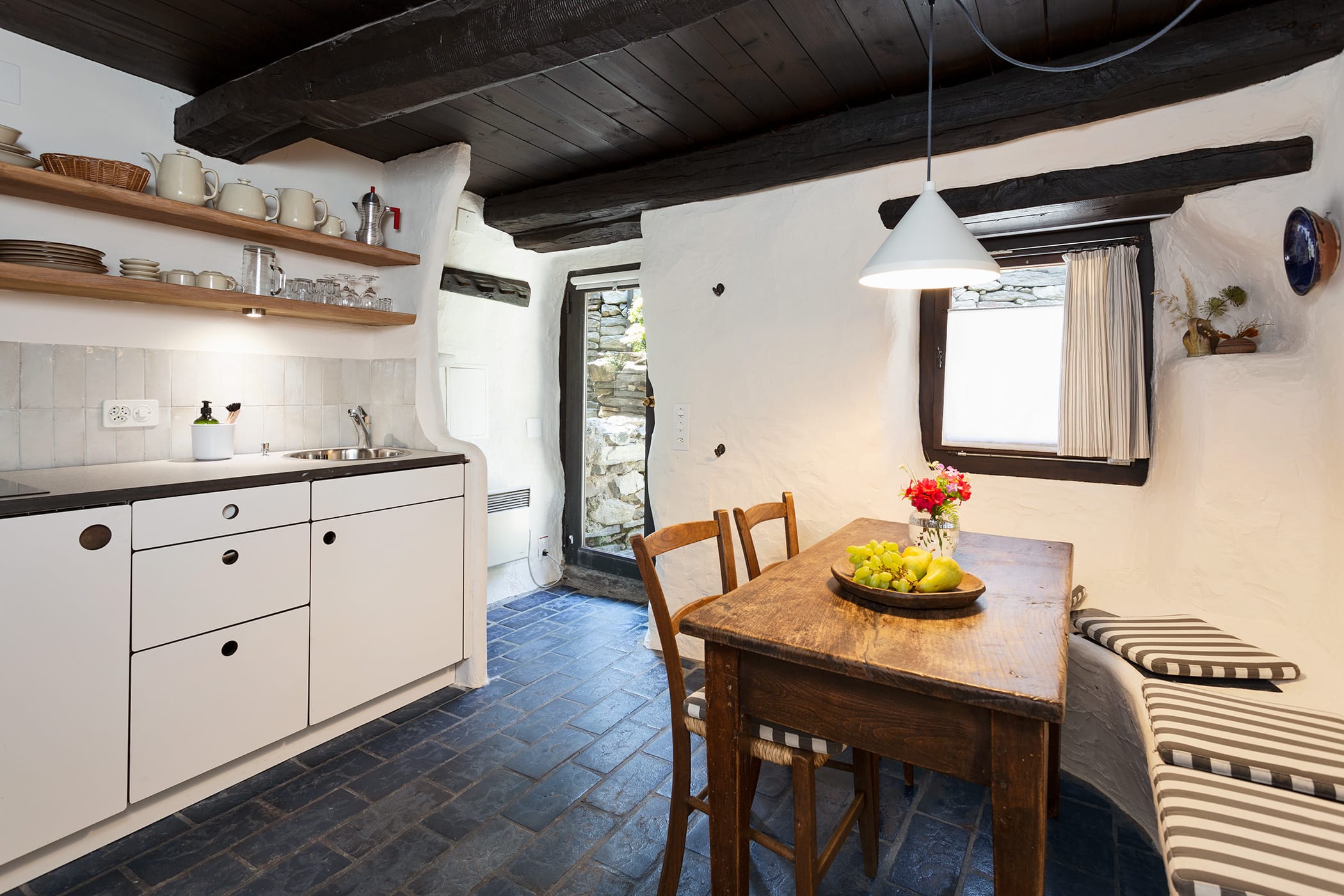 Fiordaliso ist ein Rustico (ca. 35 qm) auf drei Etagen. Highlights sind der Sitzplatz vor dem Haus, die gemütliche Wohnküche mit Chemineé und das geräumige Schlafzimmer mit Zugang zum Balkon. Der Raum unter dem Dachgiebel ist ideal für Kinder.